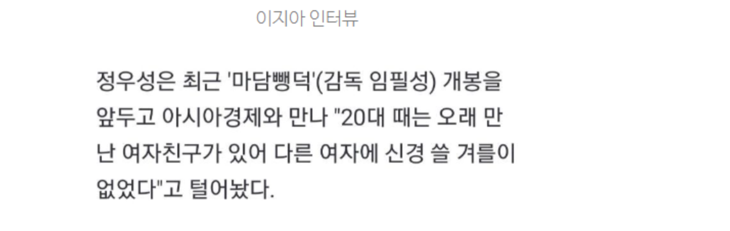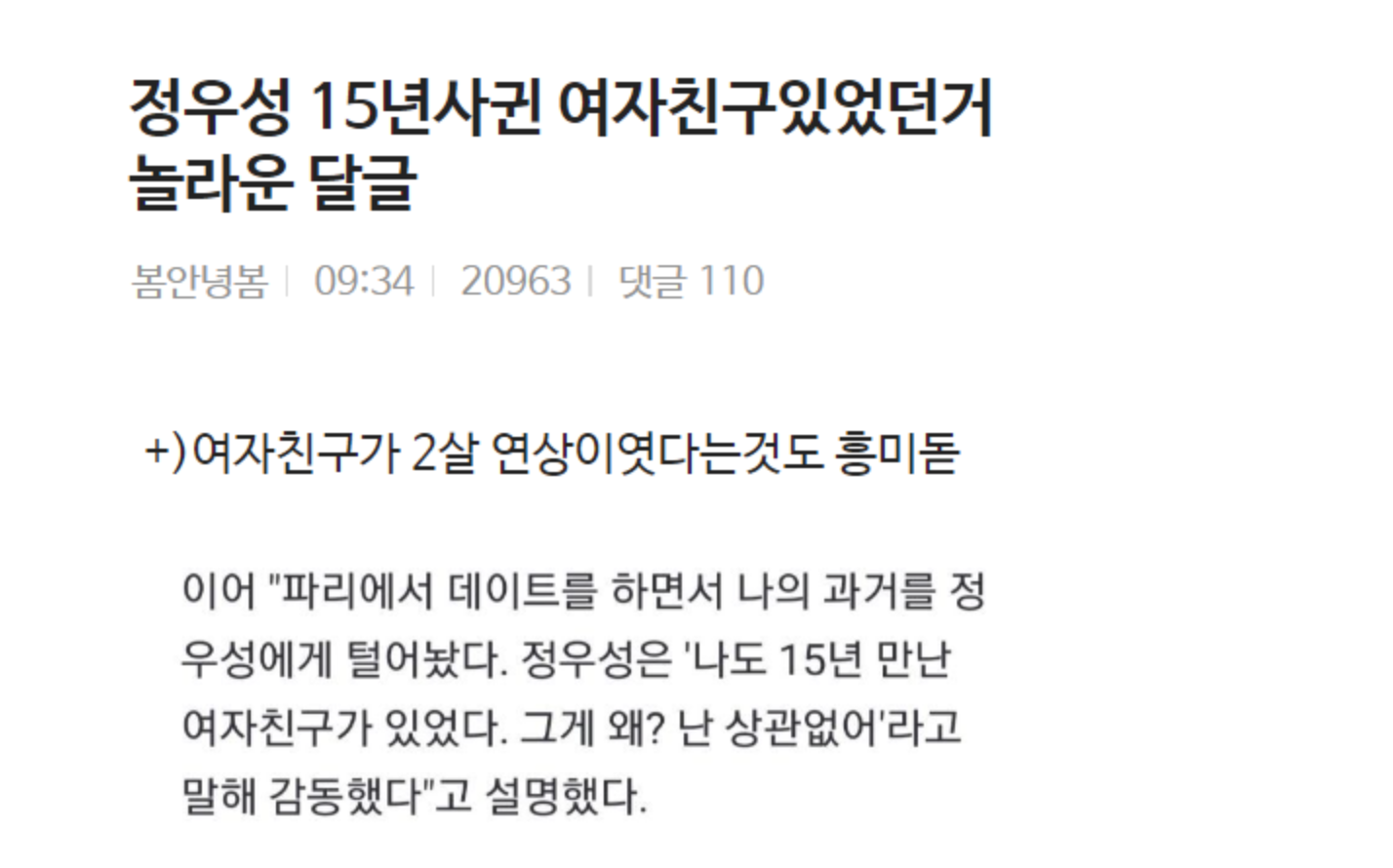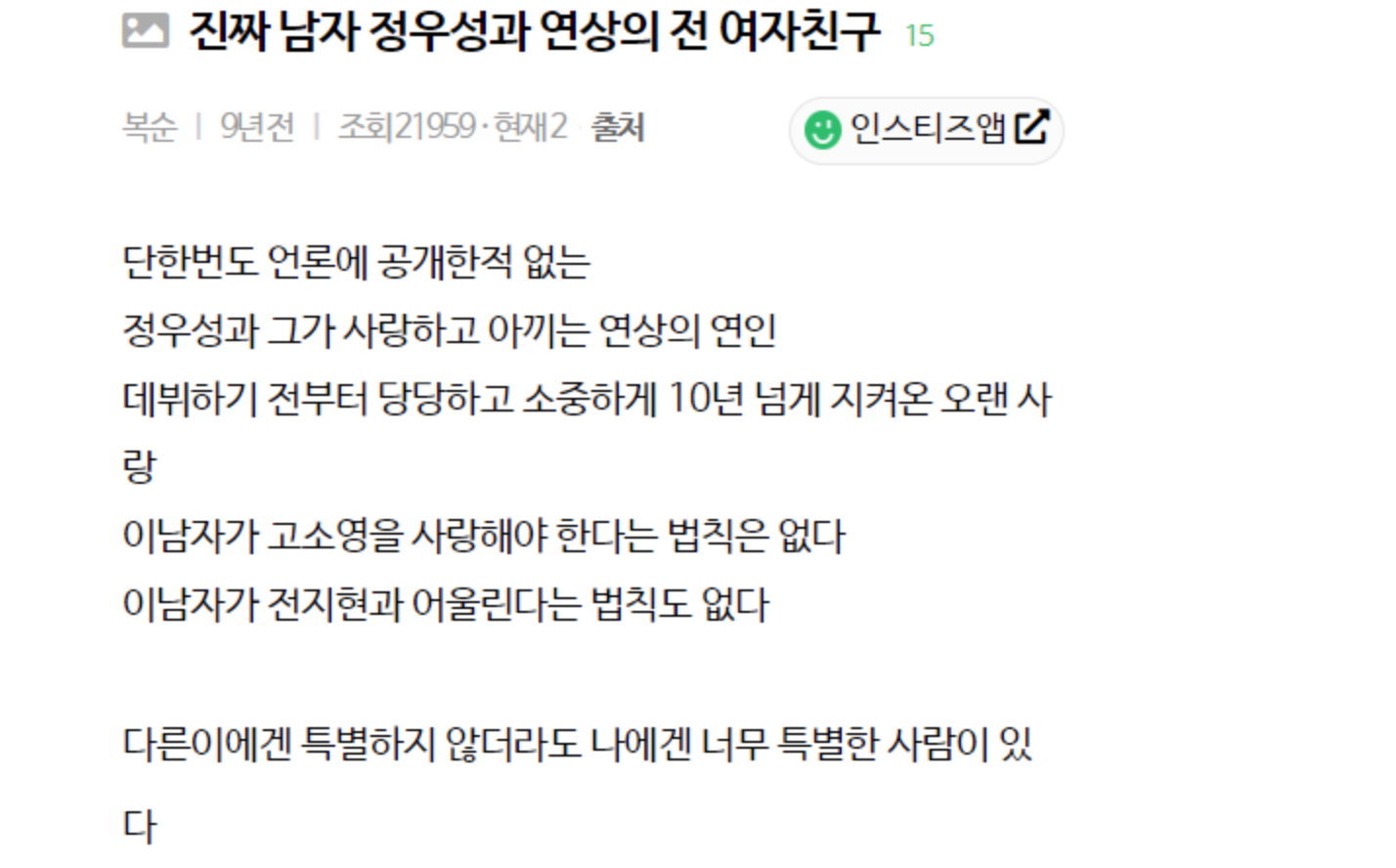 온라인 커뮤니티에는 정우성이 15년 사귄 여자친구가 있었다는 글이 올라와 누리꾼들 사이에서 엄청나게 화제가 되고 있다.