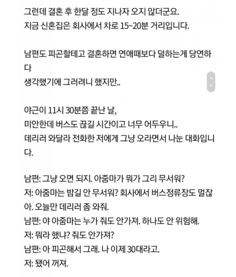 회사에서 차로 15~20분 거리라서 그러려니 했다고 하지만 대화 내용이 서러웠다고 한다.