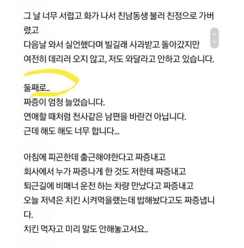 어느 날 치킨 시켜먹을랬는데 말도 안해놓고 A씨가 밥해놨다며 짜증낸 적도 있다.