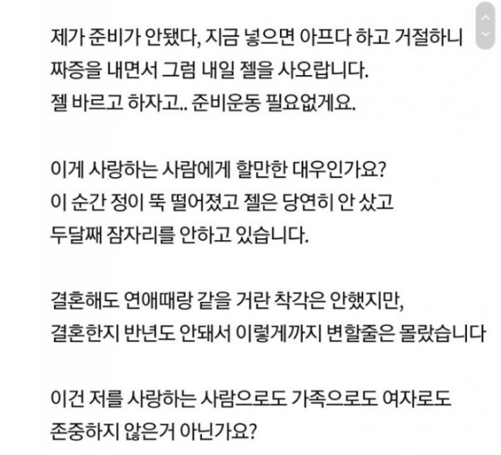 정이 뚝 떨어져버린 A씨는 젤은 물론 안샀으며 두달째 관계를 갖지 않고 있다고 한다.