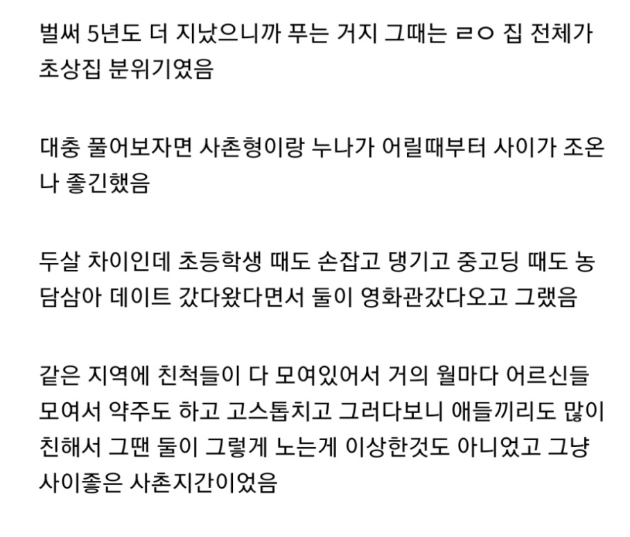 온라인 커뮤니티에 올라온 해당 글이 논란이 됐는데 충격적이게도 사촌형과 친누나가 성관계를 맺은 것을 들키면서 나온 사실들이 매우 놀랍다.