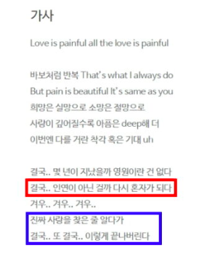 이 부분 뿐만 아니라 “누구의 잘못일까, 사랑이란 건 없다”, “차가운 네 목소리에 나도 식어가고”도 주목을 받고 있다.