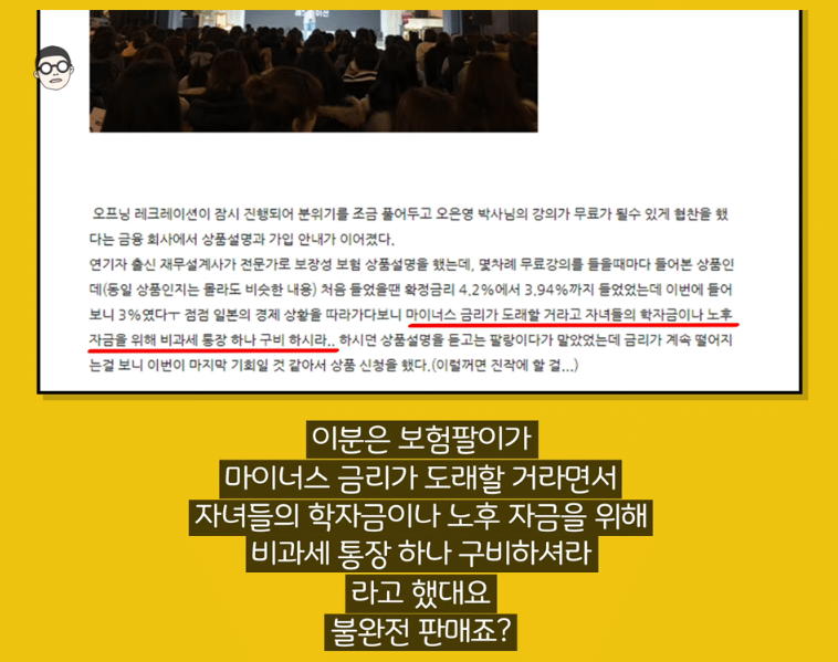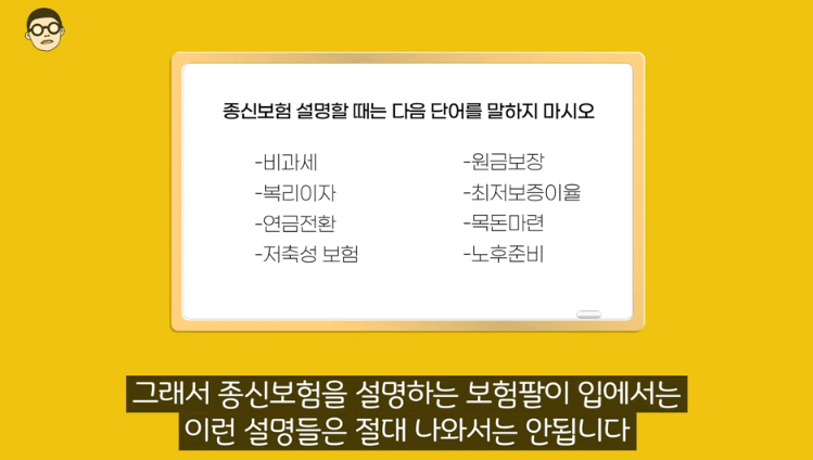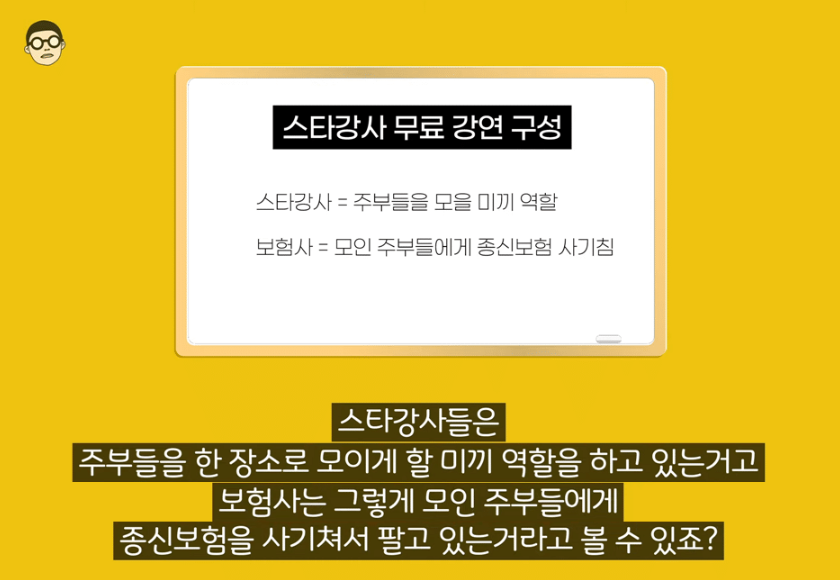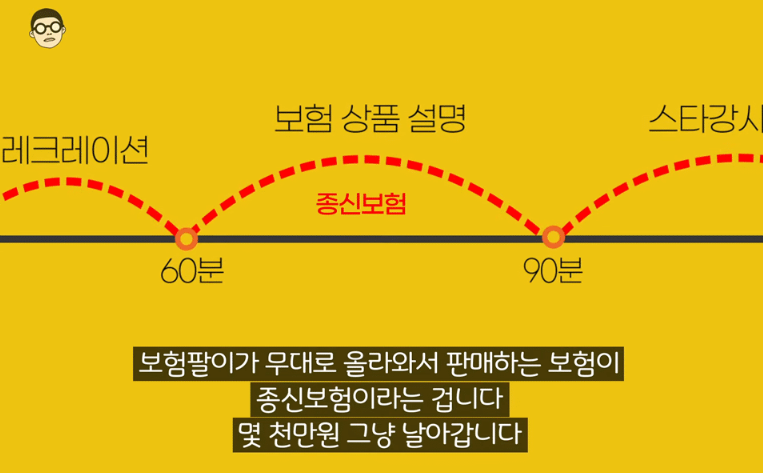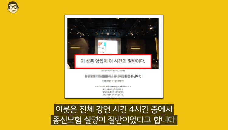 이와 같은 상황에 대해 ‘호갱 구조대’는 “마지막 1시간 반 동안 스타강사의 무료강연을 들을 수 있는 것인데, 보험설명을 강제적으로 들어야 하는 상황이다”라면서 또한 이것이 보험팔이가 무대로 올라와 판매하는 것이 종신 보험 이라는 것이다.