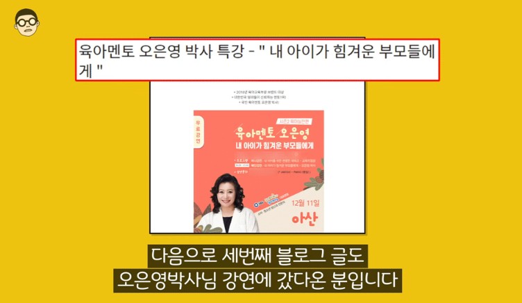 유명 유튜버 ‘호갱 구조대’는 스타 강사들의 무료 강연에 문제가 있다고 지적하며, 그중 오은영 박사님이 나오는 강연이 가지는 문제가 크다고 지적했다.