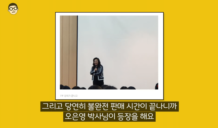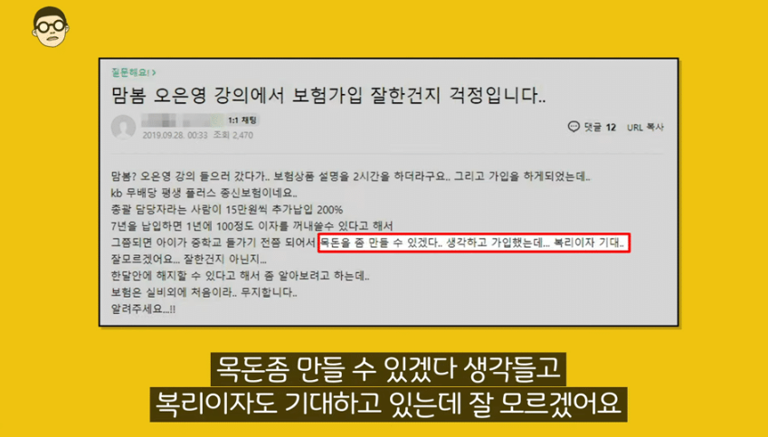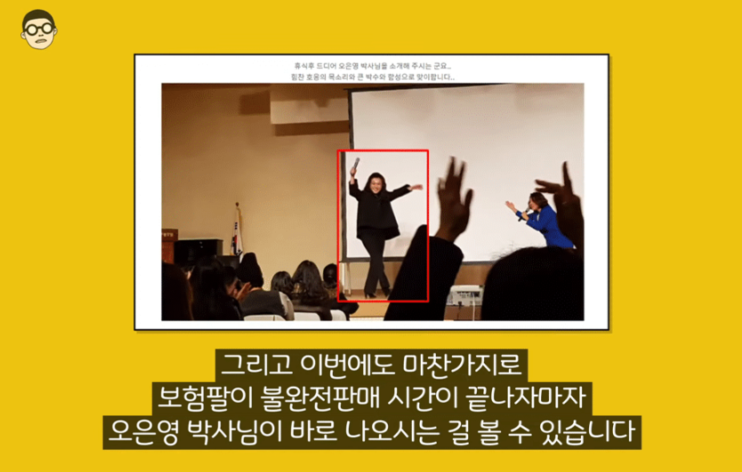 현재 호갱 구조대에 올라온 영상의 내용은 ‘오은영 박사님’의 강연을 실제로 참석해보면, 기본 4시간으로 잡혀있는 시간 중 1시간 반은 보험상품을 설명하는 시간이 끼워져 있다는 주장인데 원래 스타강사들의 강연 시간은 ①개그맨이 나와 레크리에이션, ②보험상품 설명, ③스타강사 무료 강연 시간으로 구성되어 있다는 것.