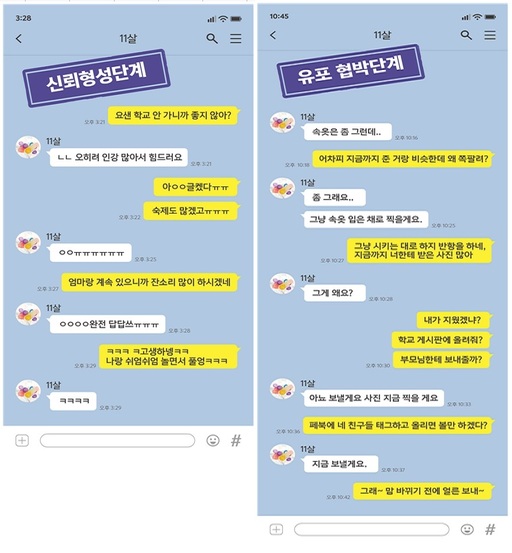 부모가 맞벌이를 해 혼자 게임하는 시간이 많았던 이모(11)양에게는 ‘엄마 잔소리 듣기 싫겠다’고 위로하며, 초등학생 박모(13)양에게는 ‘야한놀이를 하자’며 접근해 노출 사진이나 영상물을 요구하고, 피해자가 보내지 않으면 SNS 등에 유포하겠다고 협박했다.