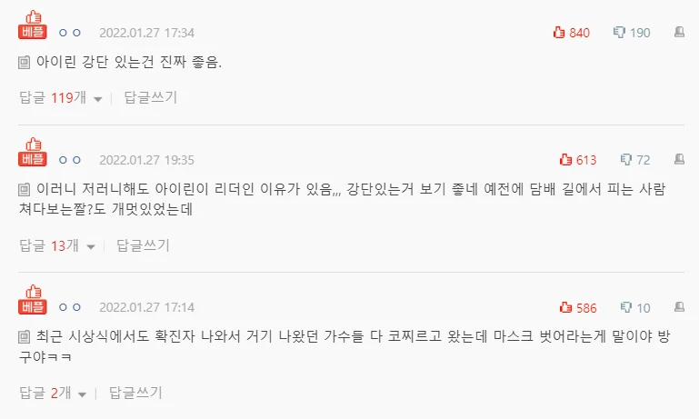 해당 사건은 각종 온라인 커뮤니티에 올라왔고, 글쓴이는 “하도 난리쳐서 벗었지만 레드벨벳 기분 안 좋을 것 같다. 이 시국에 레드벨벳한테 마스크 벗으라고 한 기자들이 문제 아니냐”고 지적했다.