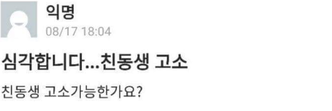 “친동생 고소 가능한가요”라는 제목의 글이 올라왔는데, 믿을 수 없게도 친동생의 장난 때문에 실제로 고소를 할지 수단을 찾는 것이었다.
