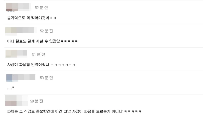 해당 글을 본 네티즌들은 “숟가락으로 퍼먹어야겠다”, “사장이 파닭을 안 먹어봤나”, “파채는 식감도 중요한 건데”라는 반응을 보였다.