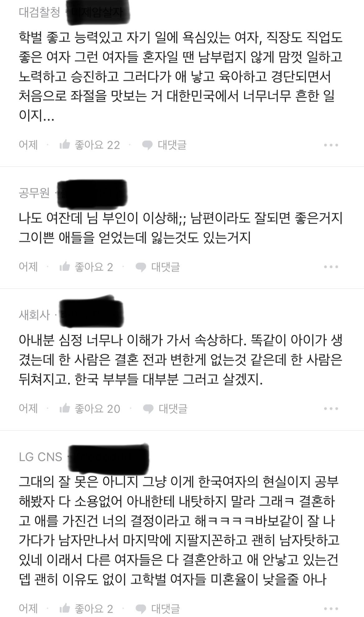 해당 게시글은 “출산육아로 인한 커리어 손해로 괴로워 하는 아내”라는 제목의 글이 올라왔다.