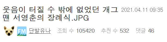 한 온라인 커뮤니티에는 ‘웃음이 터질 수 밖에 없었던 개그맨 서영춘의 장례식’이라는 제목의 글이 올라와 누리꾼들 사이에서 화제가 되고 있다.
