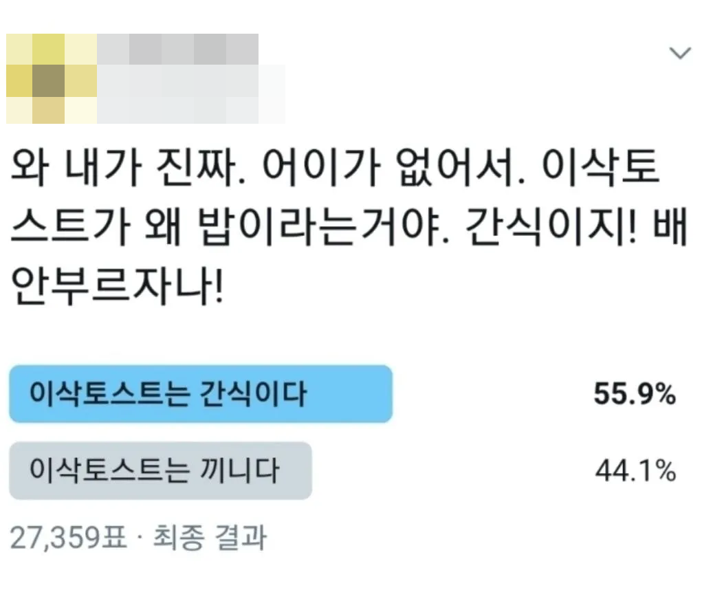 최근 트위터에는 이삭토스트가 간식인가 끼니인가에 대한 투표가 올라왔다.