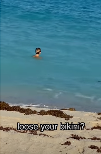 비키니가 물에 벗겨진 줄 안 여자친구는 서둘러 수영복을 찾기 시작했는데 없었다.