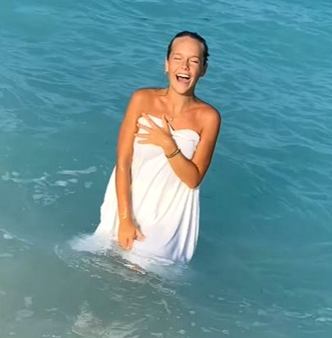 그렇게 알몸이 된 여자친구는 물 속에서 계속 있었고 데인이 몇 분 후에야 수건을 가져다 줬다.