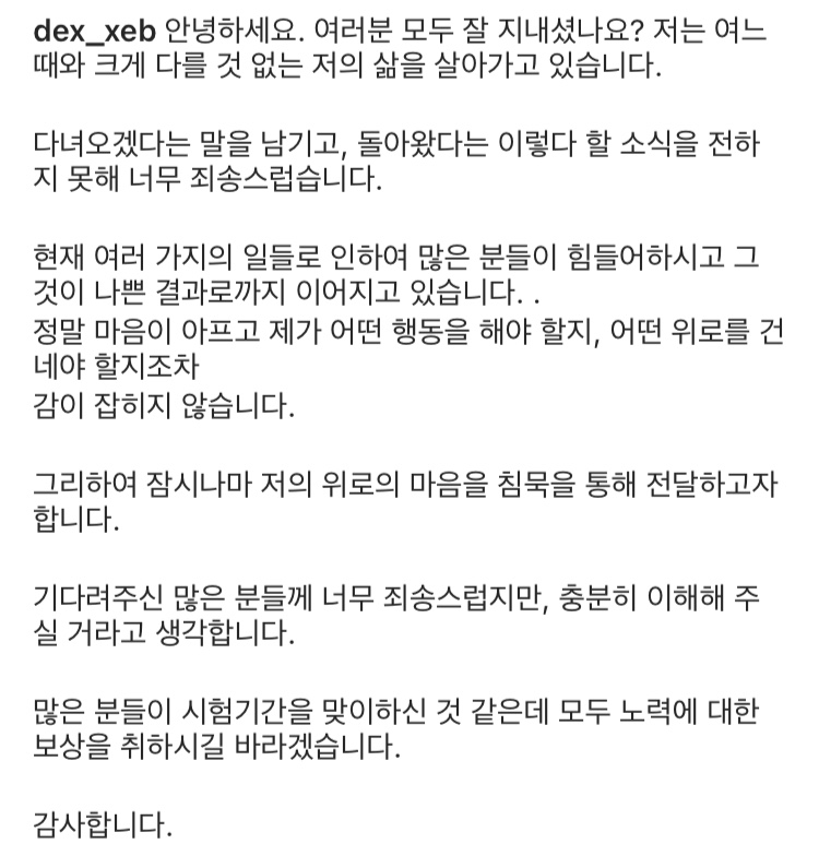 끝으로 “기다려주신 많은 분들께 너무 죄송스럽지만, 충분히 이해해주실 거라고 생각한다. 많은 분들이 시험기간을 맞이하신 것 같은데, 모두 노력에 대한 보상을 취하시길 바라곘다”고 말했다.
