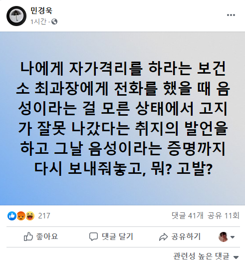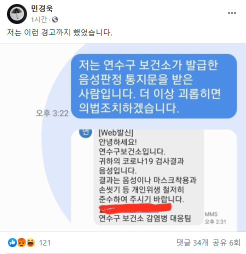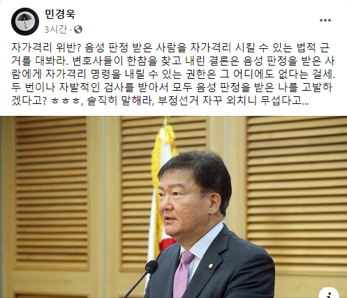 민 전 의원은 자신의 SNS에 “음성 판정을 받은 사람을 자가격리 시킬 수 있는 법적 근거가 있느냐”고 따지면서 “두 번이나 자발적인 검사를 받아서 모두 음성 판정을 받은 나를 고발하겠다고? 솔직히 말해라, 부정선거 자꾸 외치니 무섭다고”라며 올해 180석을 얻은 더불어민주당에 총선 결과를 조작했다고 암시하는 글까지 남겼다.