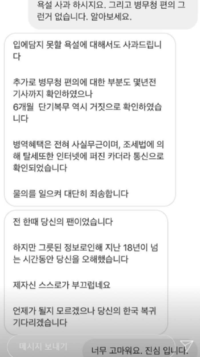 이어 “그릇된 정보로 인해 지난 18년이 넘는 시간동안 당신을 오해했습니다. 언제가 될지 모르겠으나 당신의 한국 복귀 기다리겠습니다”고 덧붙였다.