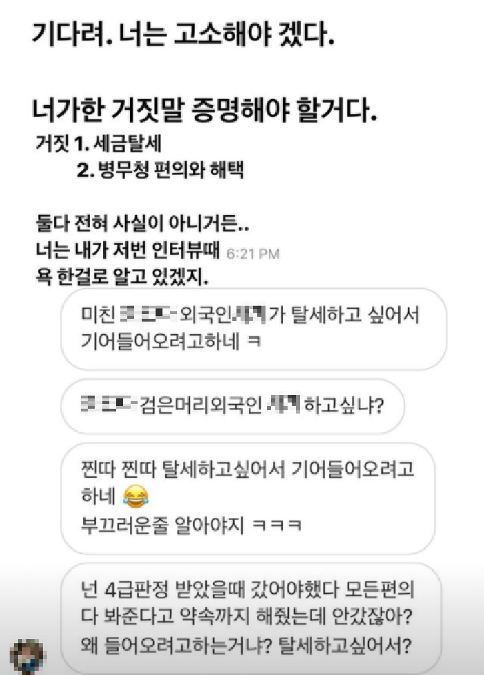 넌 4급 판정 받았을 때 가야했다. 봐준다고 약속까지 해줬는데 안 갔잖아?”라며 메시지를 보냈다. 분노한 스티브 유는 “기다려. 너는 고소해야겠다. 너가 한 거짓말 증명해야 할 거다. 세금 탈세와 병무청 편의 혜택 둘 다 전혀 사실이 아니다”라고 경고했다.