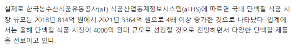 한국농수산식품유통공사 식품산업통계정보시스템에 따르면 국내 단백질 식품 시장규모가 4배 이상 증가한 것으로 나타났다.