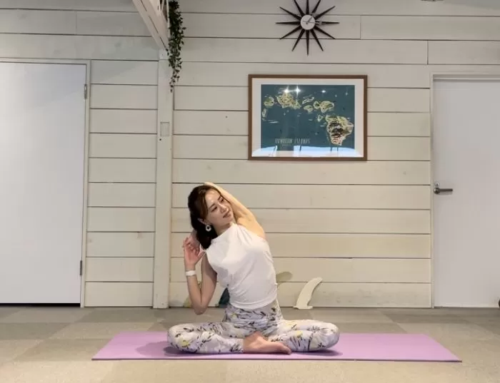 그 상태에서 오른쪽 팔꿈치를 아래로 내려 주고 왼쪽 팔꿈치를 머리로 밀어 가슴을 열어주고, 숨을 내쉬면서 내려가 있는 오른쪽 팔꿈치 쪽으로 몸을 기울여 주면서 왼쪽을 바라본다.