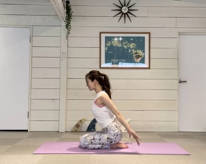 먼저 무릎을 꿇고 정자세로 앉아주고, 손바닥을 쫙 편 상태에서 양팔을 뒤로 뻗고 상체를 앞으로 뽑아내듯 펴주며 허리가 뒤틀리지 않도록 등 근육을 늘려준다.