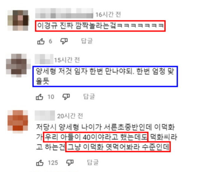 이 글을 본 많은 네티즌들은 ”이경규 진짜 깜짝 놀란 거 처음 본다”, ”양세형 저것 임자 한번 만나야되. 한번 엄청 맞을듯”, ”이덕화가 그렇게 부르지 말라고 에둘러 말하는데 엿먹어라 수준이네”라 다양한 댓글을 남겼다.
