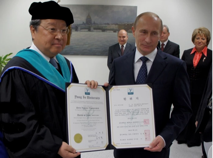 실제 용인대학교는 2010년 푸틴 러시아 대통령에게 한·러 수교 20주년을 맞아 세계 최초로 ‘명예 유도학 박사 학위’를 수여한 사실이 있는데, 당시 용인대 측은 푸틴이 평소 유도 정신을 실천하며 국제 스포츠계와 세계 평화를 위해 공헌했다고 보고 학위를 수여한 것으로 전해졌다.