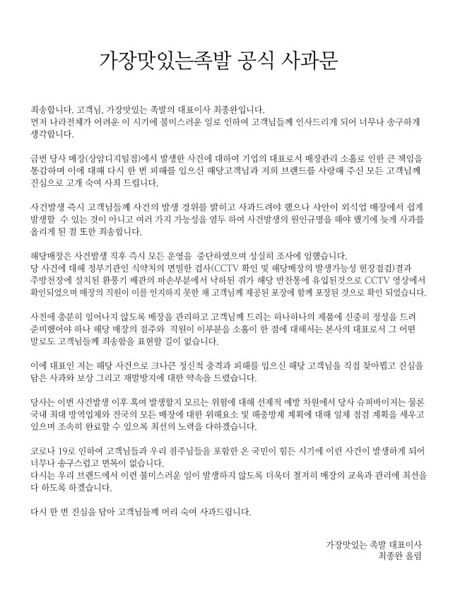 가장맛있는족발 최종완 대표이사는 “금번 당사 매장(상암디지털점)에서 발생한 사건에 대하여 기업의 대표로서 매장관리 소홀로 인한 큰 책임을 통감하며 이에 대해 다시 한번 피해를 입으신 해당 고객님과 저희 브랜드를 사랑해 주신 모든 고객님께 진심으로 고개 숙여 사죄드립니다”라고 말했다.