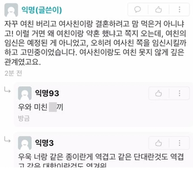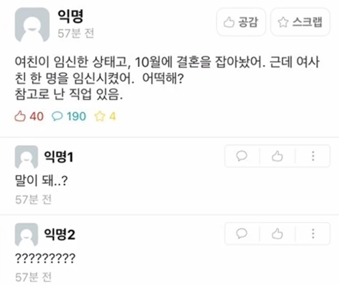 A 씨는 “여친이 임신한 상태고, 10월에 결혼을 잡아놨다”고 말하며 “그런데 여사친 한 명을 임신시켰어. 어떡해”라고 글을 썼다.