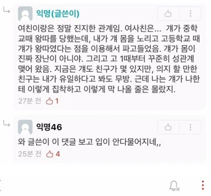 많은 비난에 A 씨는 “여사친은 중학교 때 왕따 당하던 아이다. 내가 고등학교 때 일부러 몸을 노리고 접근하긴 했다”면서 “고1 때부터 성관계를 맺었다. 걔가 몸이 진짜 장난 아니다”라고 전했다.