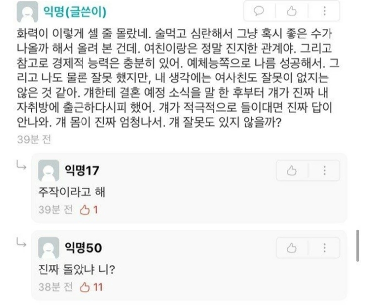 이어 그는 “내 생각에 여사친도 잘못이 없지 않다. 걔한테 결혼 예정 소식을 말한 후부터 걔가 내 자취방에 출근하다시피 했다. 걔가 적극적으로 들이대면 답이 안 나온다. 몸매가 엄청나다”고 자신의 잘못이 정당한 행동인 듯 말했다.