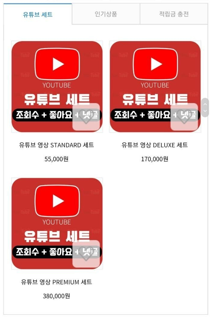 유튜브 영상 세트는 스탠다드, 디럭스, 프리미엄 총 3단계로 가격에 따라 사용자가 직접 선택할 수 있다. 스탠다드 세트는 5만 5천 원, 디럭스 세트는 17만 원, 프리미엄 세트는 38만 원이다.