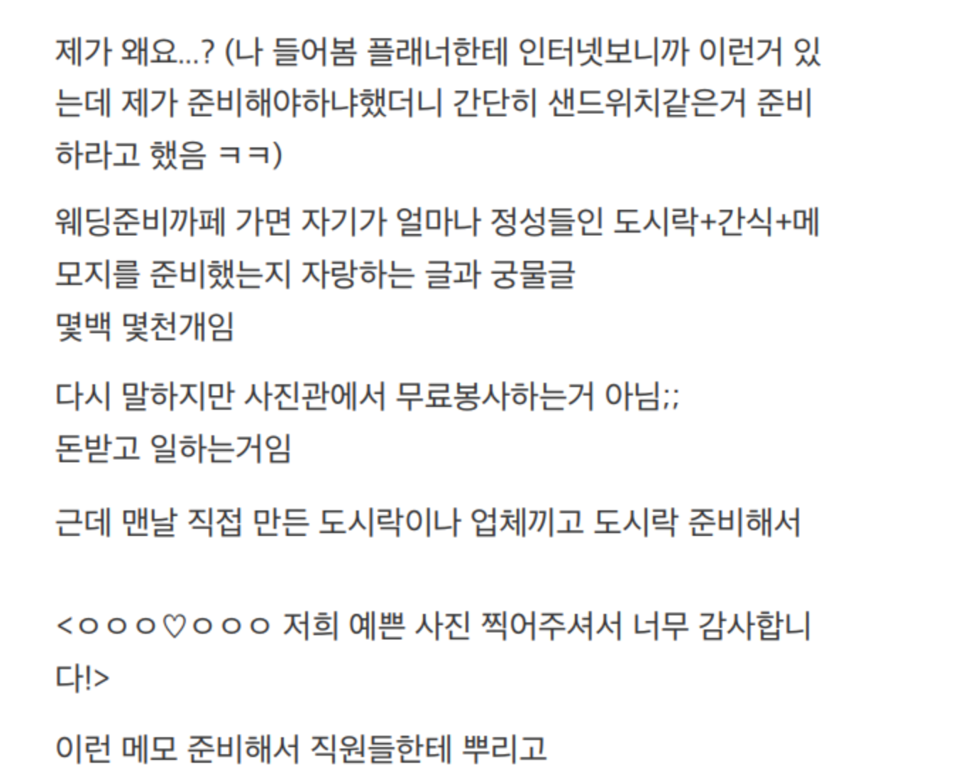 해당 게시물을 접한 누리꾼들은 “아니 이런게 왜 생긴거임?”, “진짜 결혼하기 싫다” , “겁나 귀찮을 듯..준비하는 거 “, “별 문화가 다 생겼네ㅋㅋ진짜 “라며 다양한 반응을 보이고 있다.