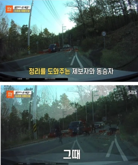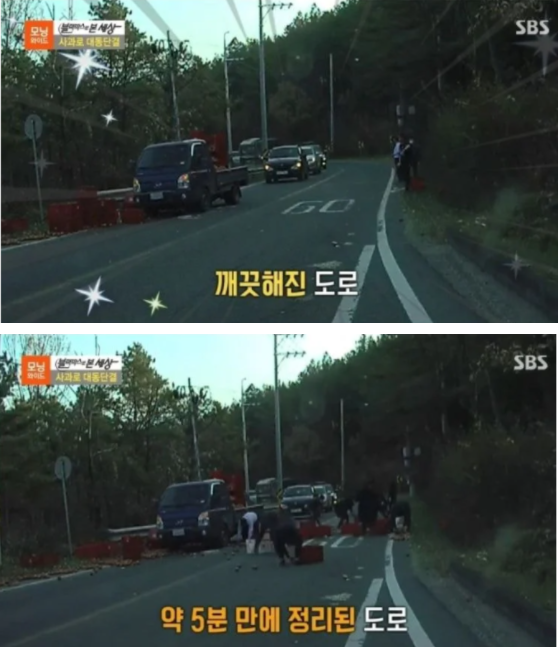 그 모습을 보고는 주저없이 뛰어와서 도로를 정리하기 시작했다.
