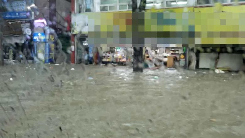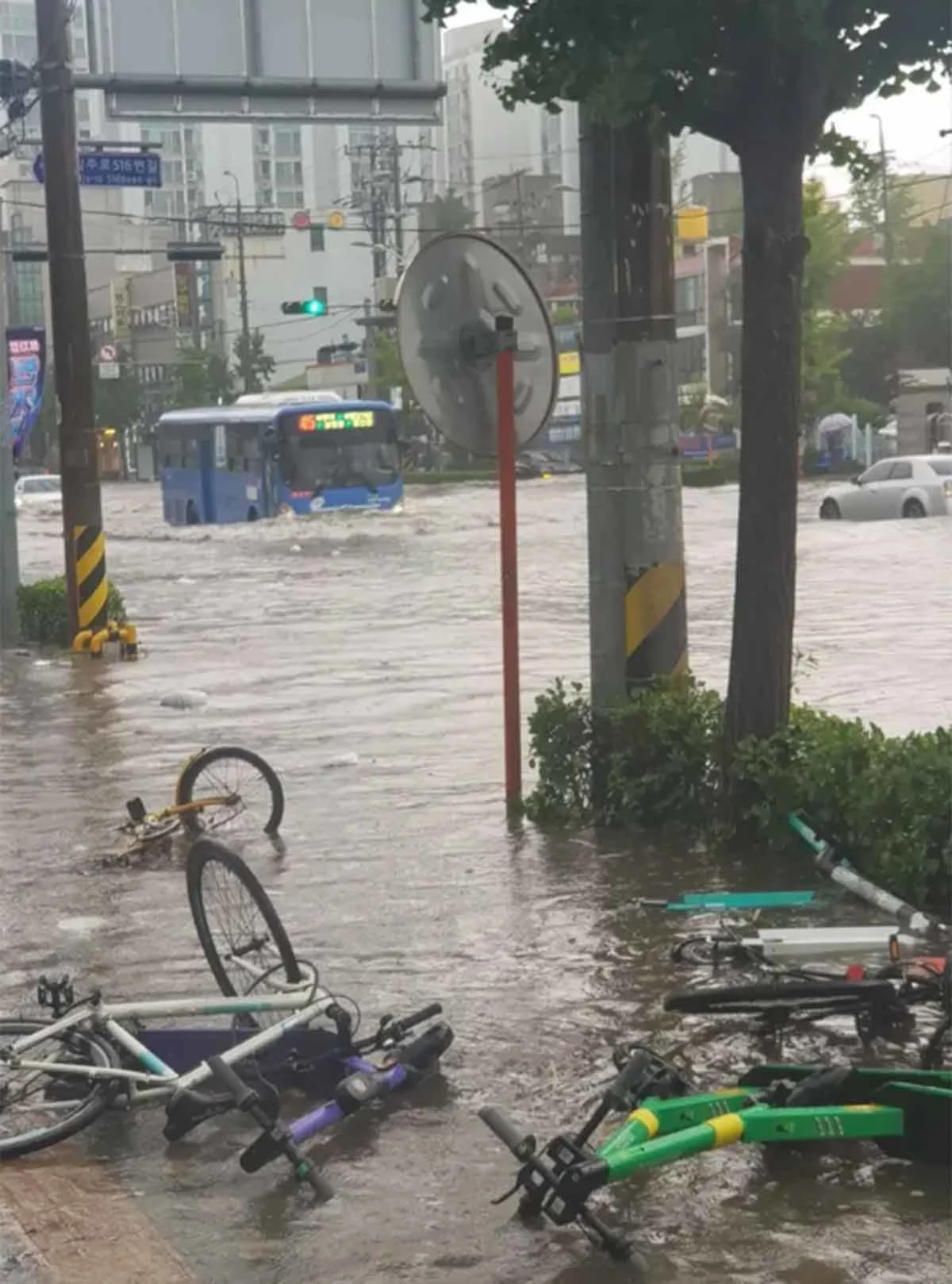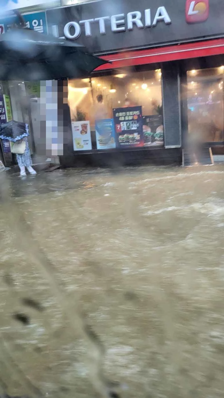 온라인 커뮤니티에는 상가가 침수돼 있는 모습을 담은 사진이 올라왔는데, 도로의 상당부분이 물에 잠겨있으며, 인도도 물에 잠겨 있었다.