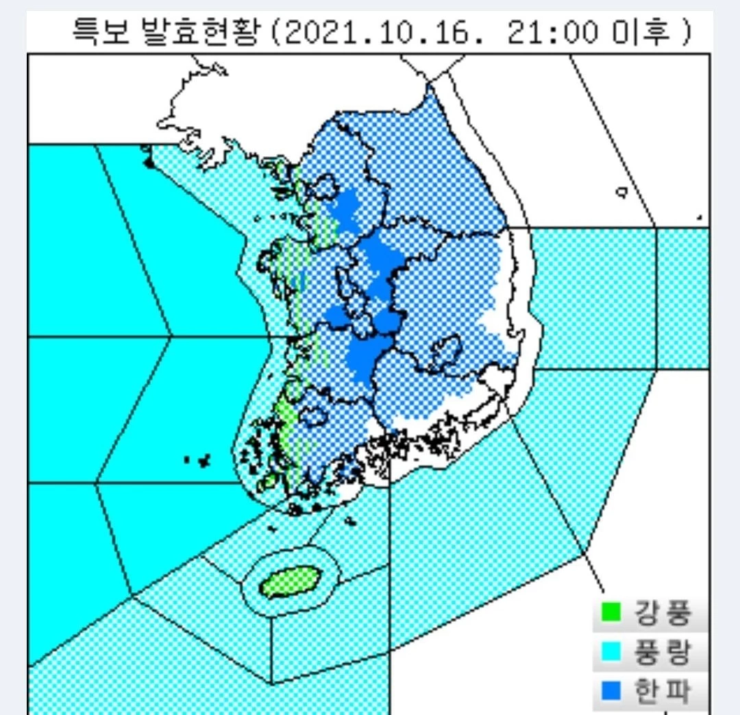 기상청은 16일 밤 9시부터 서울과 인천, 대전, 광주, 대구, 세종을 포함한 전국 대부분 지역에 한파주의보를 내렸으며, 경기 용인·광주시, 충남 논산시와 홍성군, 충북 보은·괴산·영동·음성·증평군, 전북 진안·무주·장수군에 한파경보를 발령한다고 전했다.