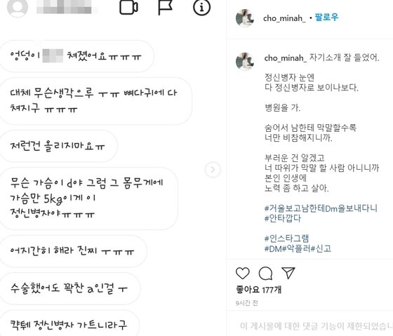 이에 조민아는 “부러운 건 알겠고 너 따위가 막말 할 사람 아니니까 본인 인생에 노력 좀 하고 살아. 거울 봐라 안타깝다. 악플러 신고”라고 말했다.