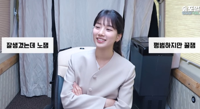 남도산에 대한 밸런스 게임 중 “잘 생겼는데 노잼 vs 평범하지만 꿀잼”의 질문을 받은 수지는 웃음을 지으며 “잘 생겼지만 노잼”을 택했다.