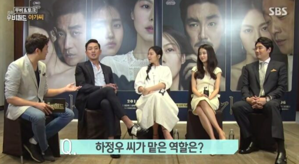 SBS 프로그램 ‘접속! 무비월드’에 출연한 하정우가 김민희와 찍은 영화 ‘아가씨’에서 맡은 역할인 “제주도 머슴 출신의 백작 행세를 사기꾼” 역할을 하게 되었다고 설명을 했다.