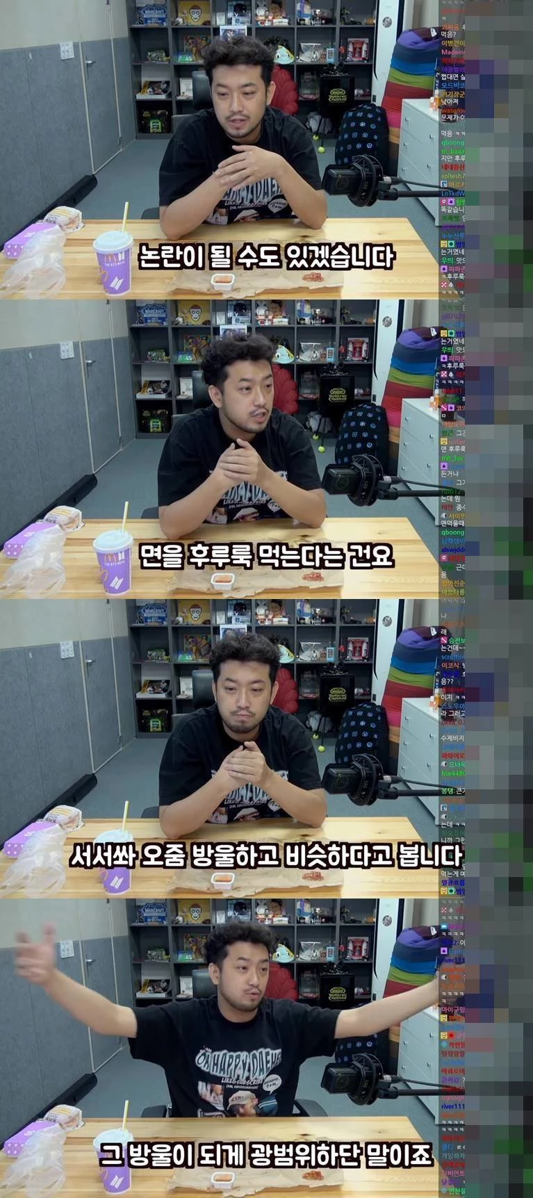 침착맨은 “더럽다는 게 아니라 퍼져나가는 범위가 넓다는 거다. 모르긴 몰라도 옆 테이블까지는 갈 거다. 과학적 근거는 없다. 그냥 뇌피셜이다. 느낌이다. 내가 욕을 먹어도 후루룩 먹는 건 아니다. 아닌 건 아니다”라고 자신의 소신을 전했다.