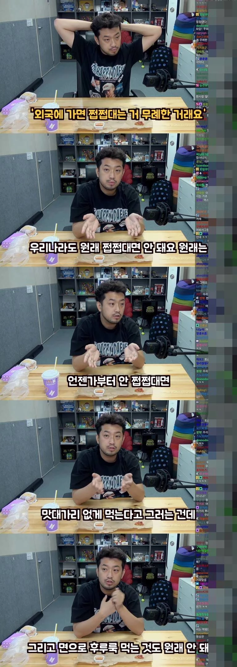 침착맨은 “우리나라도 원래 안 된다. 언젠가부터 안 쩝쩝대면 맛없게 먹는다고 하는데 면도 후루룩 먹으면 안 된다”고 말했다.