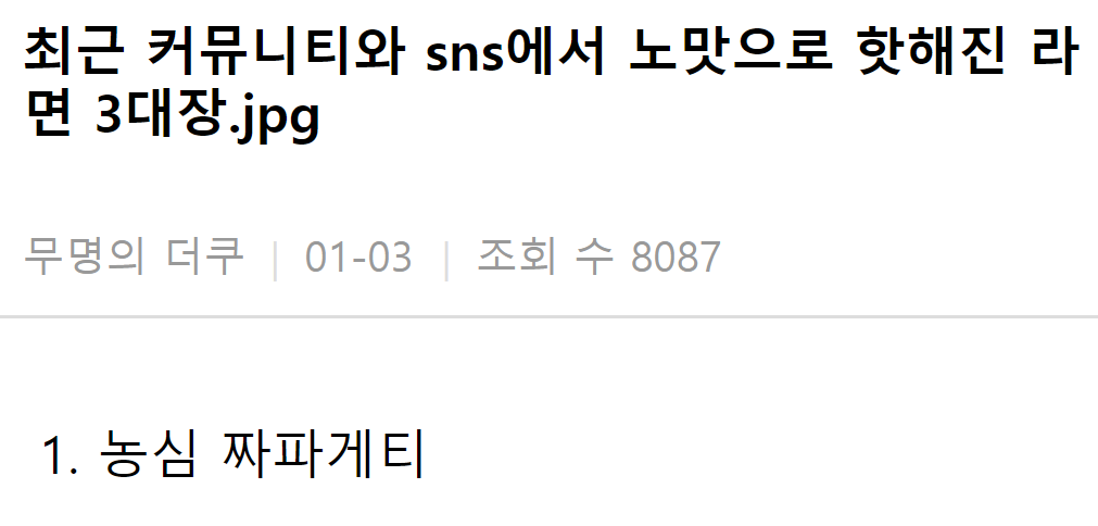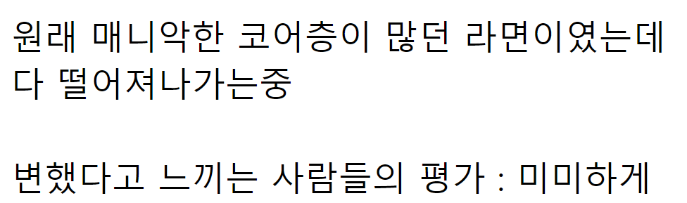 한 온라인 커뮤니티에서는 이에 관련된 내용으로 “요새 아무맛도 안난다고 말 많은 라면”이라는 제목의 글이 올라와 누리꾼들 사이에서 화제가 되고 있다.