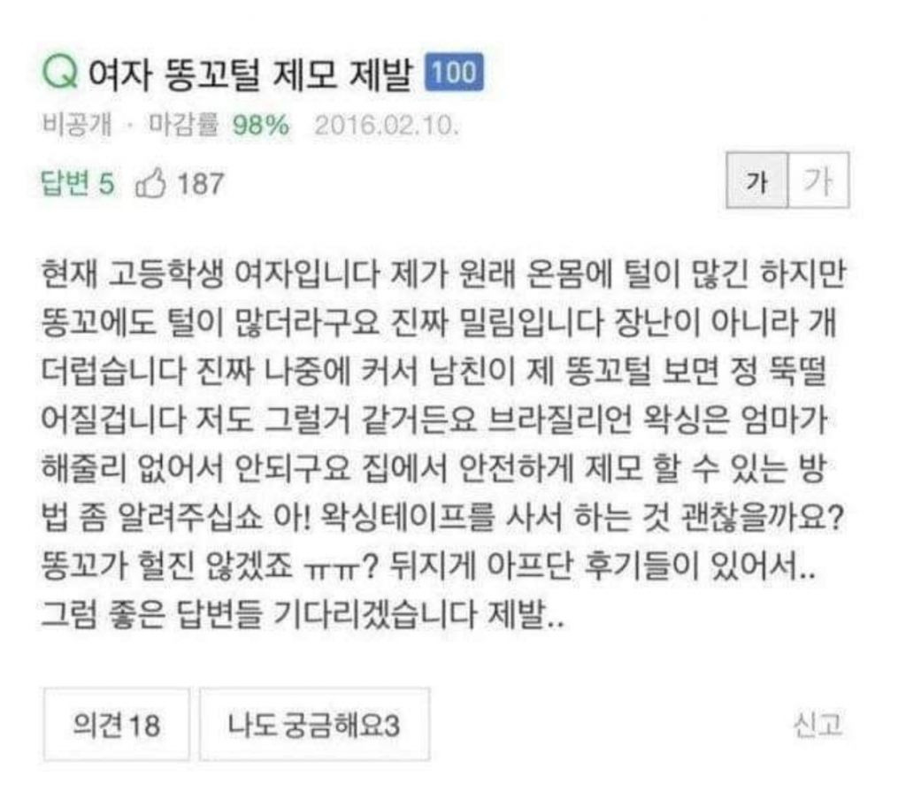 고등학생 여자라고 밝힌 한 여성이 네이버 지식in에 “여자 똥꼬털 제모 제발”이라는 제목의 글을 올려 화제가 됐는데, 글만 봐도 다급함이 느껴지는 글이다.