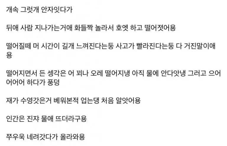글쓴이는 자살시도를 밤에 시도했으며 처음에는 두려움 마음이 강했다. 하지만 뒤에서 사람이 지나가는 모습에 놀라 물속으로 떨어졌고 떨어진 후 몸이 물에 떴다며 글을 시작했다.