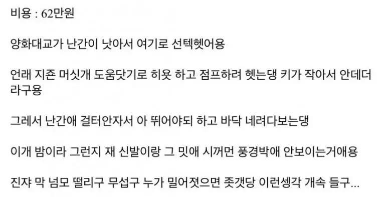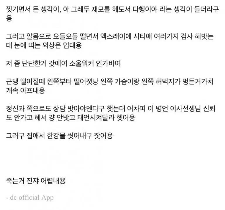 응급실로 실려간 글쓴이는 응급 처치를 받았고 옷은 다시 복구를 할 수 없게 되었지만 자신은 멍이 든것 말고는 다친곳이 없다며 ‘죽는거 진짜 어렵다.’ 라고 글을 마무리했다.