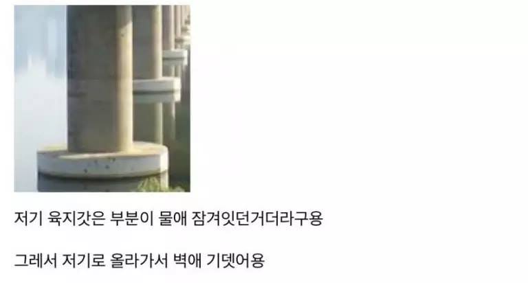 몸은 뜨지만 물살때문에 계속 잠수와 떠오르기를 반복했고 그 과정에서 물을 많이 마셔 매우 고통스럽다고 했다. 그러다 살겠다는 마음에 기둥에 손을 뻗었다.