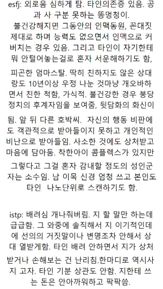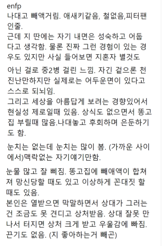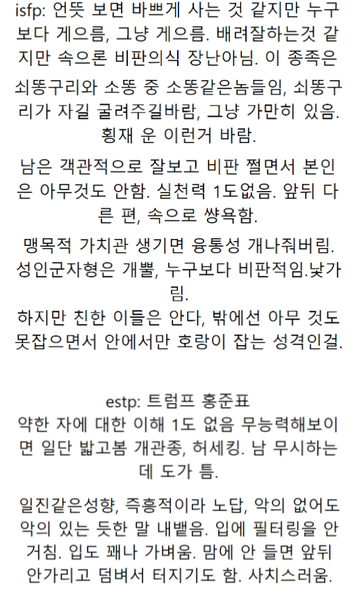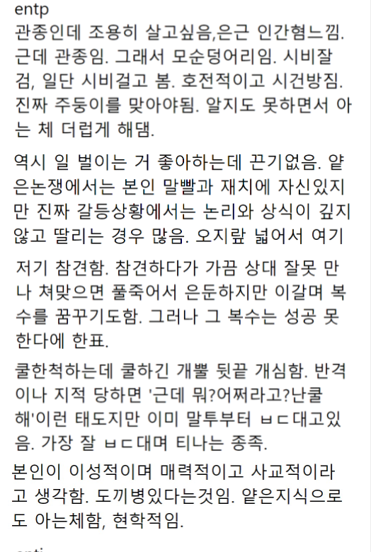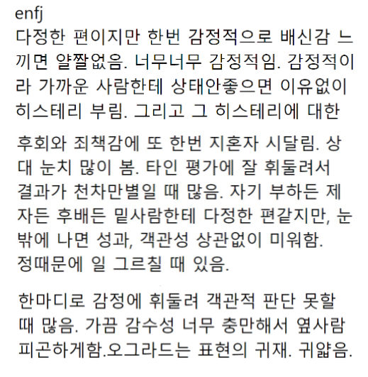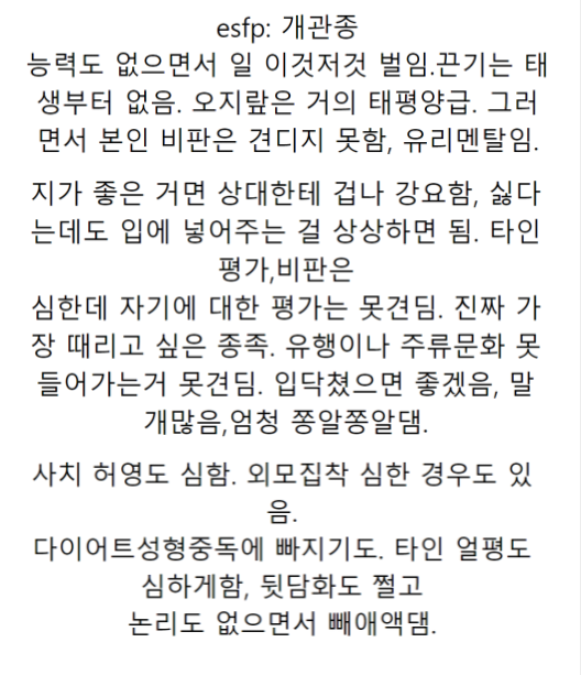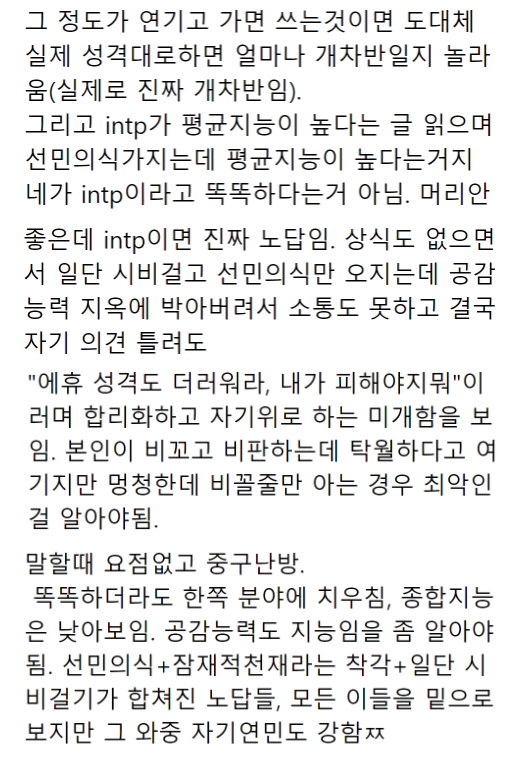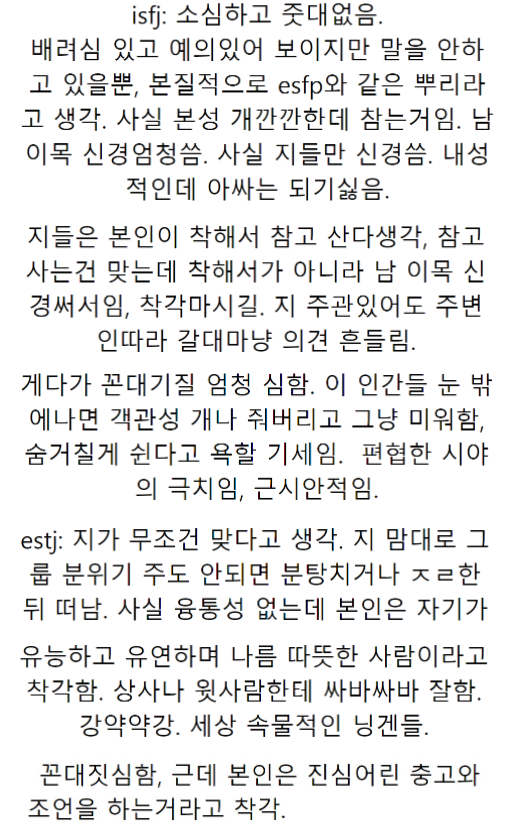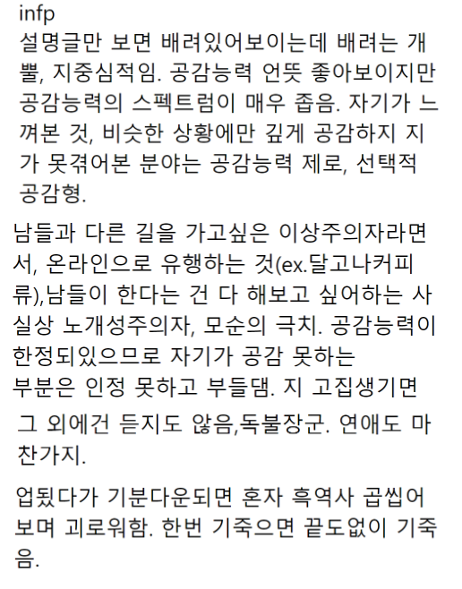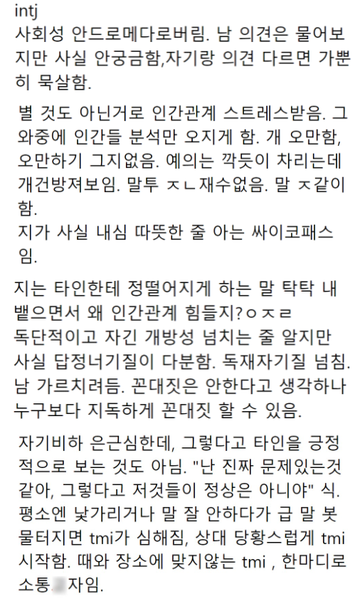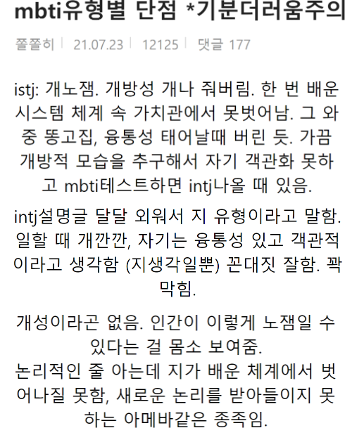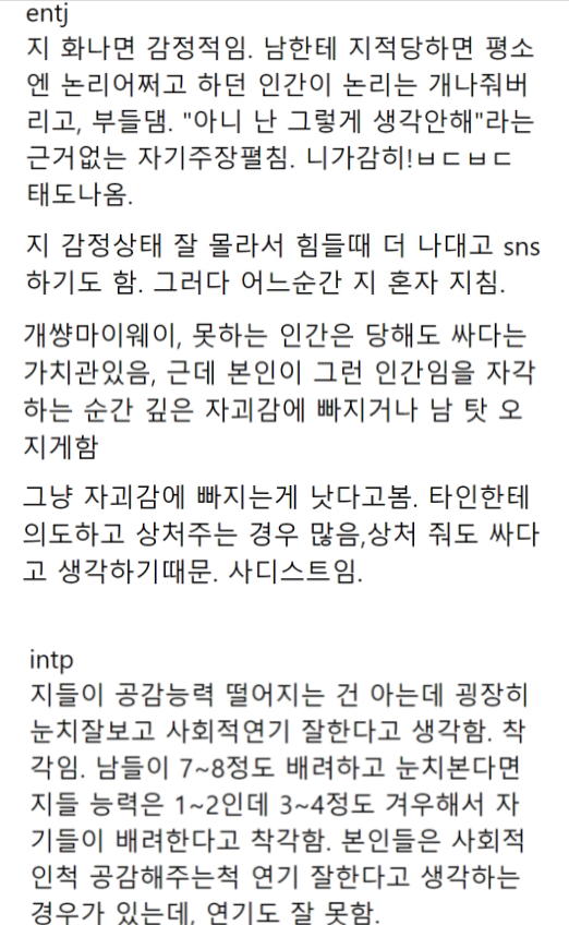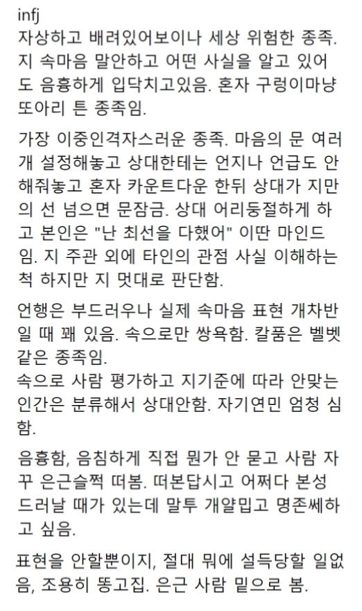 해당 게시물은 최근 유행하고 있는 성격유형검사 mbti 유형별 단점을 바탕으로 만들어졌으며, 너무나도 사실적이라 기분이 나쁠 정도로 정확한 mbti 유형별 단점이 적혀있었다.