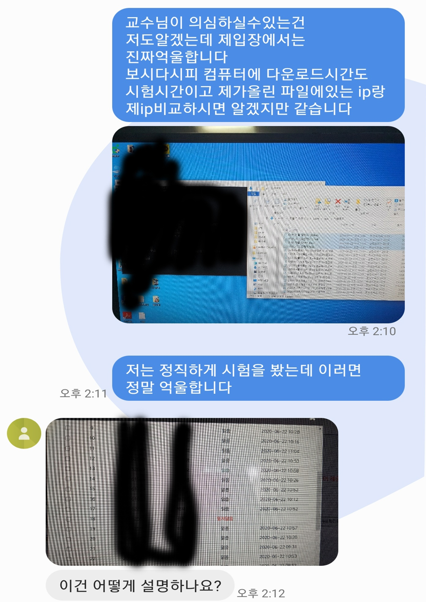 컴퓨터 다운로드 시간과 자신의 IP 주소 등을 촬영해 시험지 파일을 제 시간에 다운 받았음을 알렸다.