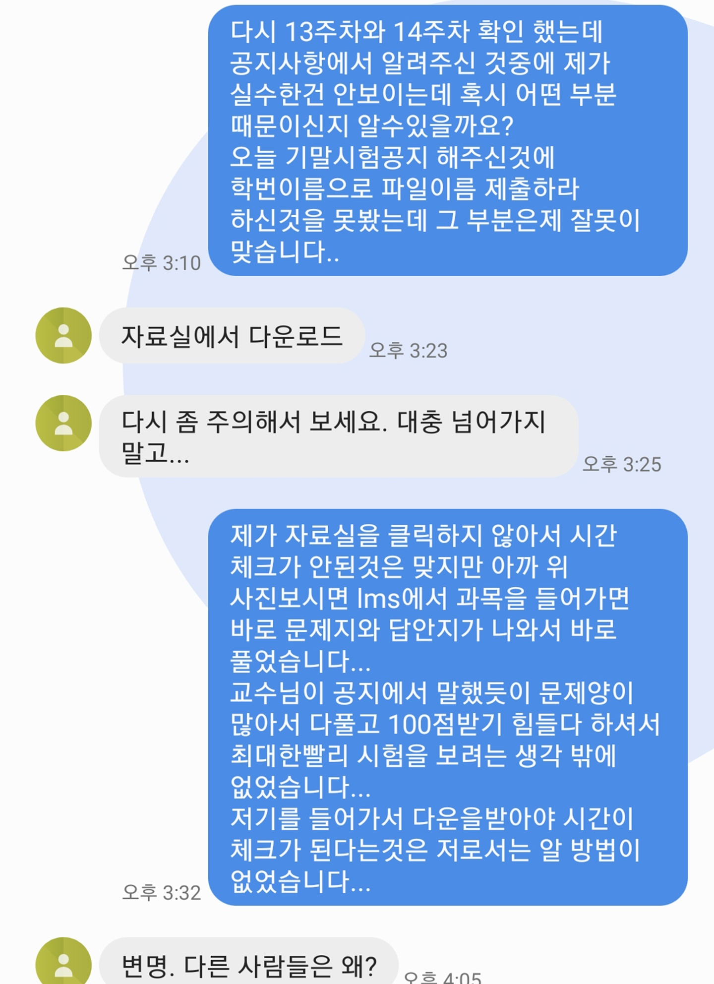 교수는 “어떻게 자료실에 접속을 하지 않고 기말고사를 제출했냐”고 물었다.