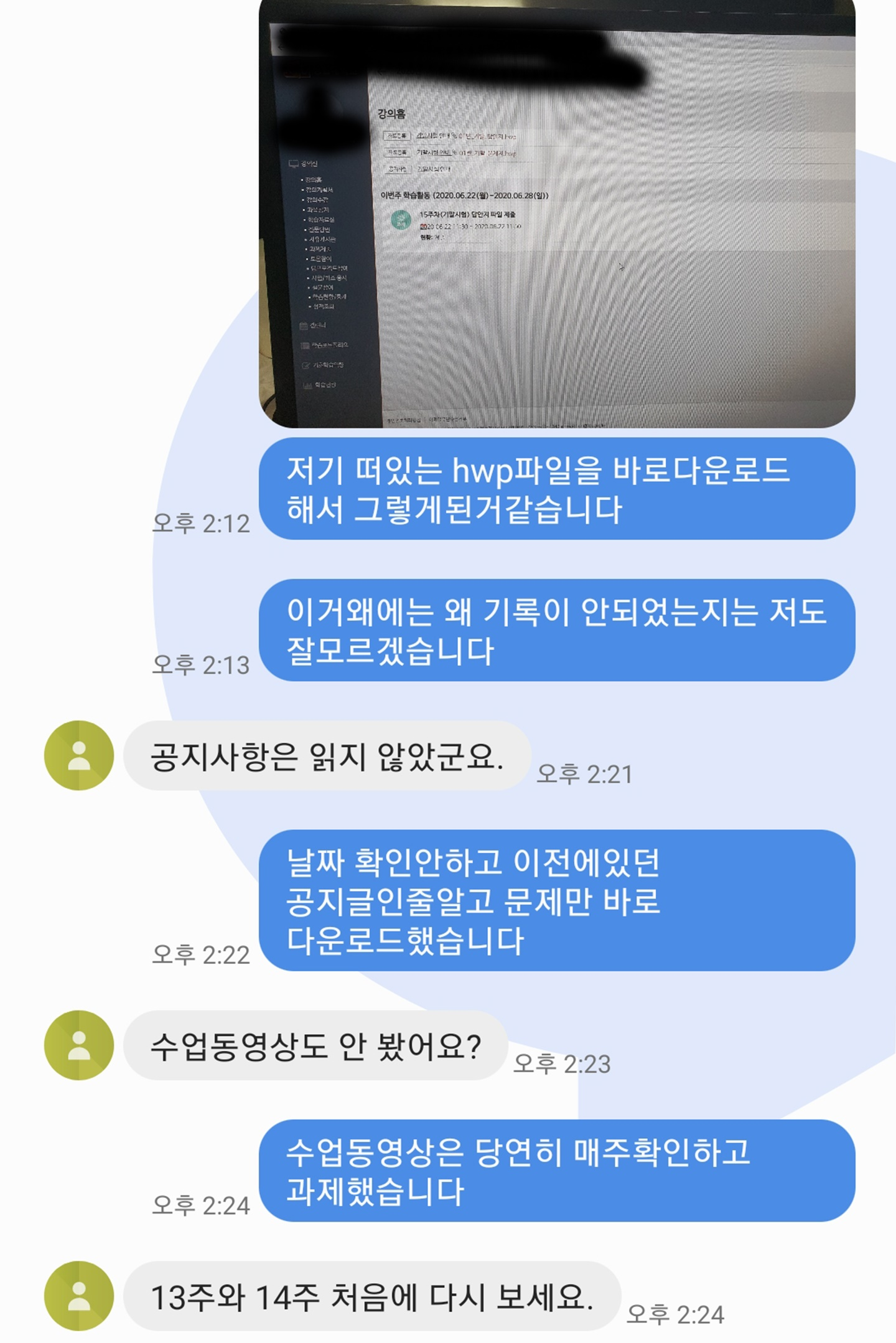 A씨의 해명에도 교수는 “변명. 다른 사람들은 왜?”, “공지사항은 읽지 않았군요”, “수업 동영상도 안 봤어요?” 등의 면박을 줬다.